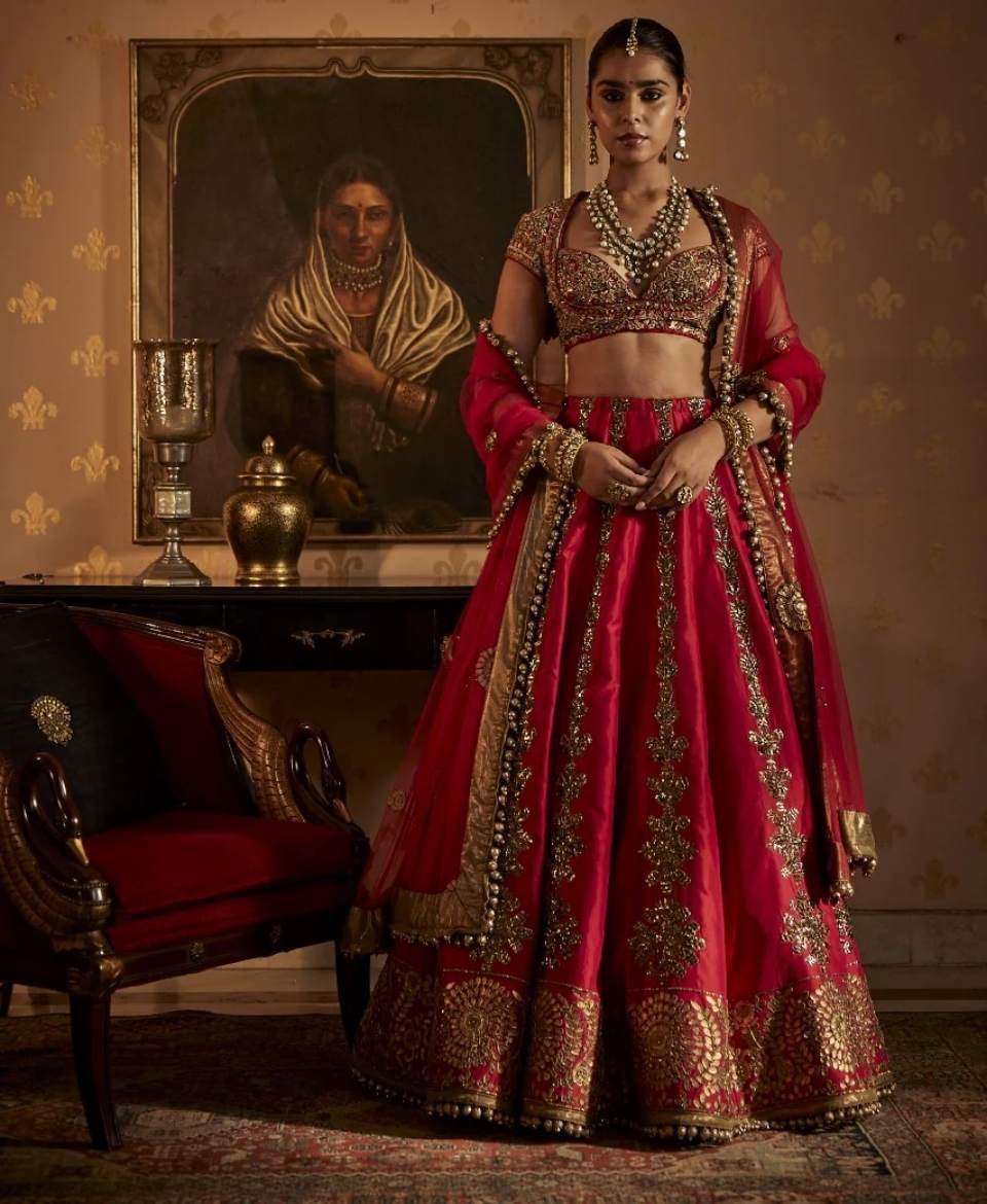 Heavy embroidered red bridal lehenga with matching choli and dupatta.